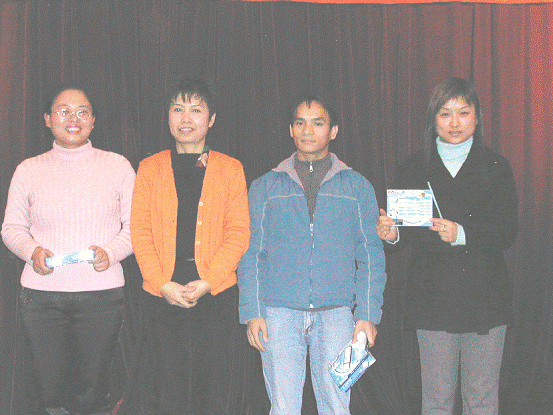 門市經(jīng)理王穎輝為獲得三等獎的三位同事頒發(fā)獎品并留影