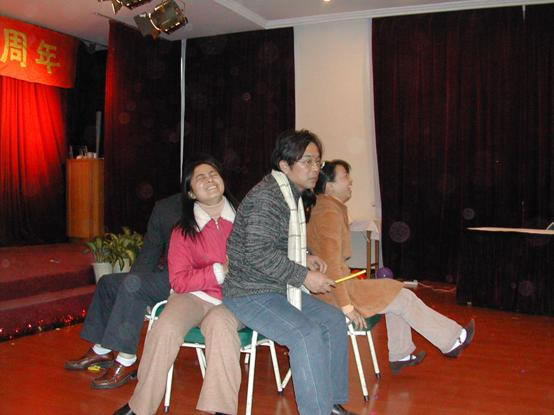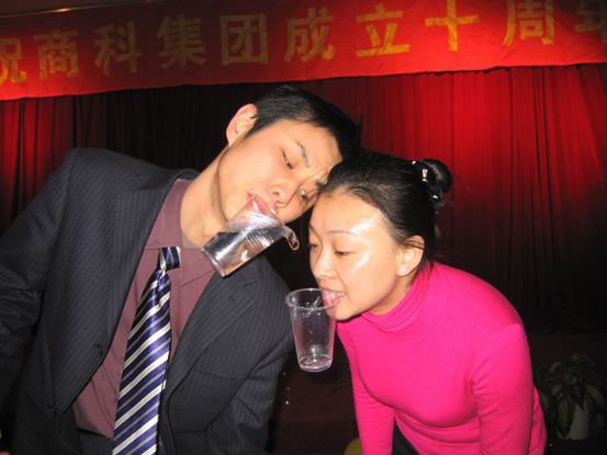 《細水長流》5人/組*2組:每人嘴上含一只杯子,第一人杯中倒?jié)M水,依次將杯中的水倒入下一人杯中,不許用手腳,最快并杯中水最多者為勝