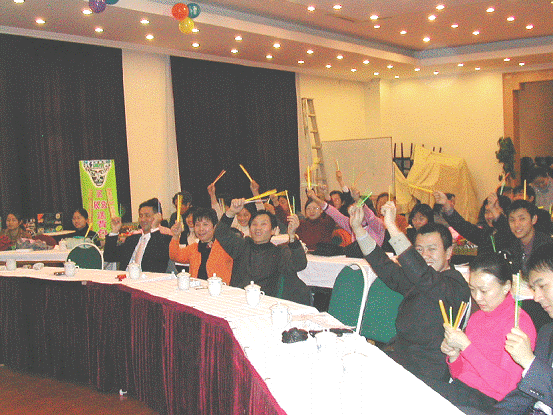 上海分公司領導帶領全體員工揮動著手中歡樂之棒,慶祝商科成立十周年活動圓滿閉幕