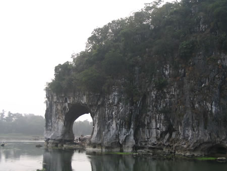 象鼻山地處桂林市的漓江與桃花江匯流處,園內(nèi)自然山水與人文景觀交相輝映,山、水、洞、亭、臺(tái)、坪,文物古跡相映成趣,美不勝收。因?yàn)橄笊娇崴埔活^大象,栩栩如生,因此被人們定為桂林市的象征。象山山體前部的水月洞彎如月亮,穿透山體,清澈的江水從洞中穿鼻而過(guò),波光洞影構(gòu)成了“水底有明月,水中明月浮”的奇景,“象山水月”因此成為桂林山水一絕。