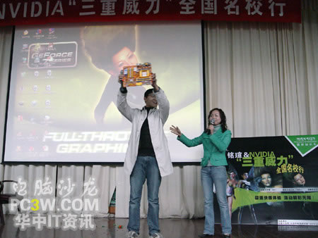 壓軸大獎(jiǎng)即將揭幕,商科集團(tuán)武漢天行電腦總經(jīng)理徐進(jìn)先生親自抽取了本次活動(dòng)的一等獎(jiǎng)。在抽出一等獎(jiǎng)后,他還激動(dòng)的表示,特別設(shè)立一個(gè)特等獎(jiǎng),將一塊NF4 SLI的主板作為特別獎(jiǎng)勵(lì),由獲得一等獎(jiǎng)的這位MM抽出。