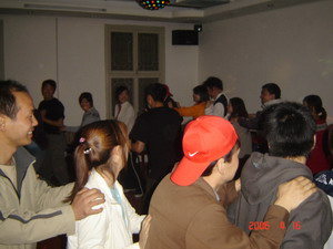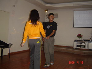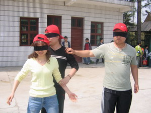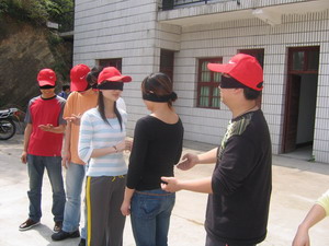 盲人摸號(每隊選出9個成員均戴上眼罩,每人一個號,此號只有本人知道。小組成員在“全盲全啞”狀態下,根據每人的號數,按從小到大的順序排列出一條直線。全盲全啞?那怎么溝通呀?聽起來有點兒難度哦,但武漢商科人果然聰明,雖然中間出了一點兒小差曲(有人差點兒偏離隊伍),但兩個隊均在7分鐘和8分鐘內準確的排列出順序,是一點兒不差哦。教官都說我們的成績是相當不錯呀。唉,不得不佩服我們自己呀。^-^)