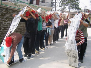 鐵甲戰車(記得坦克是怎么前行的嗎?軸帶動履帶向前進。教官“丟”給我們每個隊一小疊報紙和一小圈透明膠。有限的資源,50米的距離,報紙為“履帶”,人為“滾軸”, 我們要前行啦!)