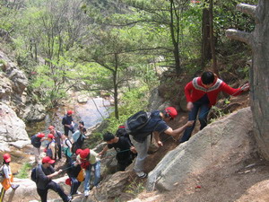 在春天的腳步已來臨之季,讓我們一同從城市的喧囂、工作的壓力中掙脫出來,2006年4月16日武漢商科一行25人,踏上勇敢者之路, 在兩天的拓展活動中,真切地體驗到團隊的存在和原來的真實自我,每一次的獲取都讓我們感動……來,和我們一同感受“共同面對問題,共同分享快樂!”吧!!雙峰山主峰由兩座對峙且相鄰的峰嶺組成,海拔888米,為孝感市第一高峰,相傳為董永、七仙女"仙化"而成,其森林繁茂,氣候宜人,素有"仙源"之美譽。