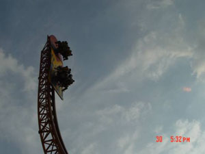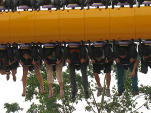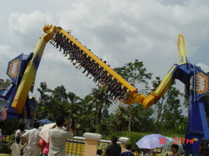 十環(huán)過山車 最聲名顯赫的游戲,亞洲首臺、全世界第二臺(僅在英國有一臺)、單項(xiàng)設(shè)備投資超過人民幣一億元,打破游樂設(shè)備環(huán)數(shù)最多的世界記錄,并創(chuàng)造了世界吉尼斯記錄。
