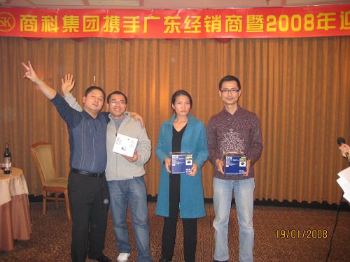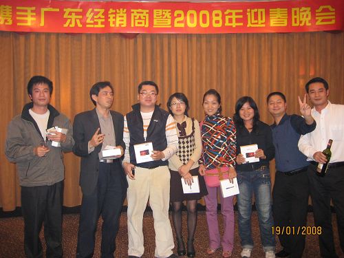 大家都吃喝的差不多的時候,大會最令人興奮的頒獎及抽獎活動便拉開了帷幕。商科廣州分公司為本次大會準(zhǔn)備了現(xiàn)金大獎、名牌筆記本、高檔DV及相機(jī)、臺電MP3、臺電攝像頭等在內(nèi)的豐富獎品。由商科集團(tuán)市場部經(jīng)理 陳濤女士頒發(fā)第一組2007年“年度優(yōu)秀代理商”,共六名。