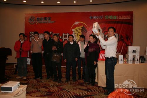 本次會議有眾多經(jīng)銷商應(yīng)邀赴會,更有來自NVIDIA和intel的嘉賓光臨現(xiàn)場,其中包括來自NVIDIA公司的彭華先生,以及INTEL公司的吳偉先生。而我們太平洋電腦網(wǎng)江西站作為到會的媒體代表,也被作為嘉賓介紹給大家。與上面的幾位重量級人物一起被主持人隆重介紹給廣大商家,筆者實(shí)在是感到有點(diǎn)汗顏!會議首先由NVIDIA公司的彭華先生為大家介紹阿凡達(dá)與NVIDIA的淵源(原來《阿凡達(dá)》出色的CG效果可是由NVIDIA的顯卡打造而成的)以及NVIDIA公司的新技術(shù)與政策。然后再由江西商科總經(jīng)理吳暉先生講話,再后就是對2009年度成績突出的商科合作伙伴進(jìn)行表彰頒獎(獎品非常豐厚哦,竟然是臺電上網(wǎng)本)。最后就是激動全場的抽獎活動了!
