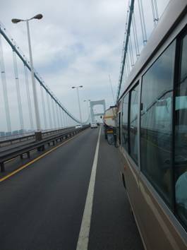 經(jīng)過(guò)整整九個(gè)多小時(shí)的長(zhǎng)途跋涉,下午六點(diǎn)多,終于即將到達(dá)我們的第一站,在進(jìn)入市區(qū)的時(shí)候恰巧夕陽(yáng)西下,一輪紅日慢慢隱沒(méi)與橋的那一頭,又一副壯美景觀呈現(xiàn)于眼前。。