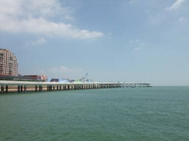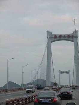 從導(dǎo)游宋小姐口中得知,海滄大橋乃是世界第二,亞洲第一的特大型三跨全漂浮鋼箱梁懸索橋,全長(zhǎng)五千多米(嘿嘿,當(dāng)時(shí)沒(méi)記住詳細(xì)數(shù)據(jù),查資料得知全長(zhǎng)5926.527米,主跨648米);大橋的索塔采用門式結(jié)構(gòu),橋柱各部結(jié)構(gòu)采用曲線造型為基調(diào)的設(shè)計(jì)構(gòu)思,型體上線條流暢,輕柔,使大橋本身也為了一座藝術(shù)精品。 遠(yuǎn)遠(yuǎn)望去,銀藍(lán)色的橋體與碧藍(lán)色的天空相輝映,似長(zhǎng)虹如玉帶般橫臥在粼粼的海面上。一條條平行鋼絲索股,掛在門式索塔上,舉目望去行駛的汽車仿佛飛翔在藍(lán)天碧海中,縱橫交錯(cuò),真是美不勝收的畫卷。