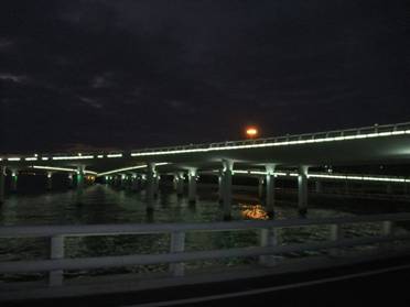 當(dāng)旅行巴士進(jìn)入市區(qū)行至環(huán)島路西段時(shí),一座壯美獨(dú)特的大橋又躍然于眼前。此時(shí),正值華燈初上,遠(yuǎn)遠(yuǎn)看去只見一長(zhǎng)排橋墩呈橢圓型立于水中,空中橋身則為流暢的弧線形,橋上燈火輝煌,橋下波光蕩漾,就如同一條騰出水面的白龍,強(qiáng)烈地震撼著我們的視覺,原來(lái)這就是著名的“演武大橋”。