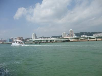 金門島游輪合影 次日,乘坐游輪環(huán)游小金門島再次經(jīng)過(guò)演武大橋,立于船頭遙望廈門市區(qū),只見大橋迎面聳立海上,與夜景絕然不同,她與岸同高, 呈S形的路段環(huán)繞著廈門大學(xué)的海景房,流線型的梁體緩緩延伸,波浪似地起伏著;遠(yuǎn)遠(yuǎn)看去,如長(zhǎng)龍臥波,欲騰空而起,細(xì)看時(shí) 又似展翅飛翔的白鷺,躍出水面的白鰭豚,簡(jiǎn)捷流暢的線條,精美靈動(dòng)的造型,給人以強(qiáng)烈的視覺美感。