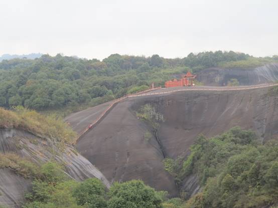 午飯后來到今天的第二個景點“飛天山”。飛天山為丹霞地貌,大旅行家徐霞客曾贊嘆飛天山“無寸土不麗,無一山不奇”,并鐫刻“寸土佳麗”。境區(qū)山頂相連,溝壑縱橫,精巧處如精雕細琢,巧奪天工,宏偉處如橫空出世,壯志凌云。