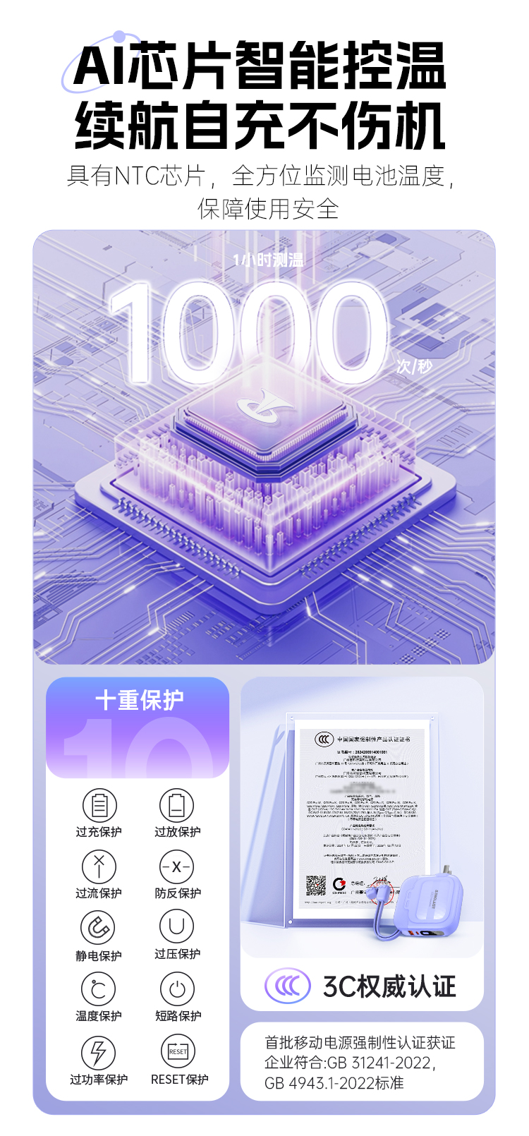 這款充電寶最大的亮點在于其自帶插頭和雙線的設計。無需攜帶額外的充電線和插頭,直接插入插座即可為充電寶本身充電,同時也能為其他設備充電。這樣的設計極大地簡化了充電過程,讓您的和背包行李箱不再被各種充電線纏繞,真正實現了“一寶在手,充電無憂”。