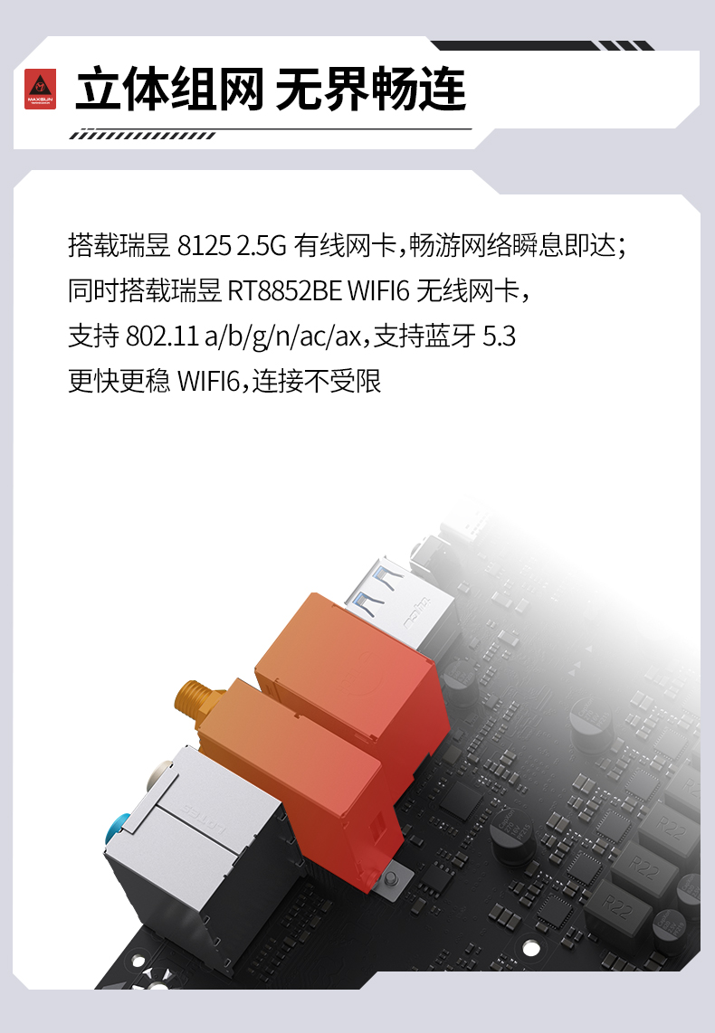 網(wǎng)絡體驗是電競玩家的 “生命線”,該主板搭載瑞昱8125 2.5G有線網(wǎng)卡,暢游網(wǎng)絡瞬息即達;同時搭載瑞昱RT8852BE WIFI6無線網(wǎng)卡,支持802.11 a/b/g/n/ac/ax,支持藍牙5.3。更快更穩(wěn)WIFI6,連接不受限。像在《三角洲行動》這類多人在線競技游戲中,穩(wěn)定且高速的網(wǎng)絡能夠確保游戲延遲始終保持在較低水平,避免因網(wǎng)絡卡頓導致操作失誤,讓玩家盡情享受游戲樂趣。