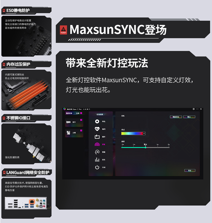 除此之外,貼心設計讓裝機與使用更省心。主板內(nèi)置了Debug自檢燈,遇到故障一鍵排查;一鍵重置CMOS按鍵,哪怕是新手裝機,遇到問題也能快速排查,裝機過程更順暢;全新燈控軟件 MAXSUN SYNC 更是顏值加分項,支持多種自定義燈效模式,打造專屬電競氛圍,讓主機不僅是性能利器,更是桌面顏值擔當。