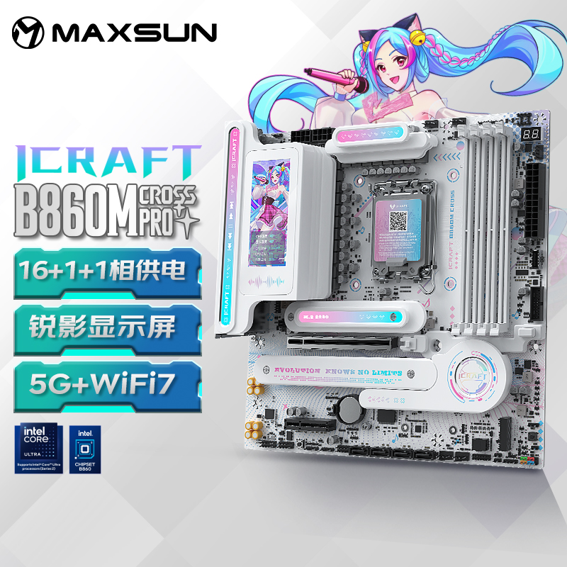 銘瑄iCraft B860M CROSS PRO璦珈主板,作為顏值旗艦,全面支持銘瑄全新的PTM UI BIOS,操作更便捷。吸睛亮點則是充滿細節(jié)的個性化屏幕,全新配備銘瑄銳影屏,3.4英寸銳影LED顯示屏支持多種模式設置,除了可實時顯示系統(tǒng)信息、個性化開關機畫面外,還可開啟桌面映射,同步顯示專屬畫面或影像,通過銳影屏配套軟件MAXSUN View,探索無限自定義玩法。全面支持銘瑄全新的PTM UI BIOS,性能實力自然也是高水平,供電升級,采用16+1+1相供電設計,核心供電50A Dr.Mos,輕松駕馭英特爾® 酷睿™ Ultra 9 處理器 285K;配備前后置雙USB-C®,后置USB4® 40G接口,支持最高40Gbps傳輸速率,數(shù)據(jù)傳輸更高速。
