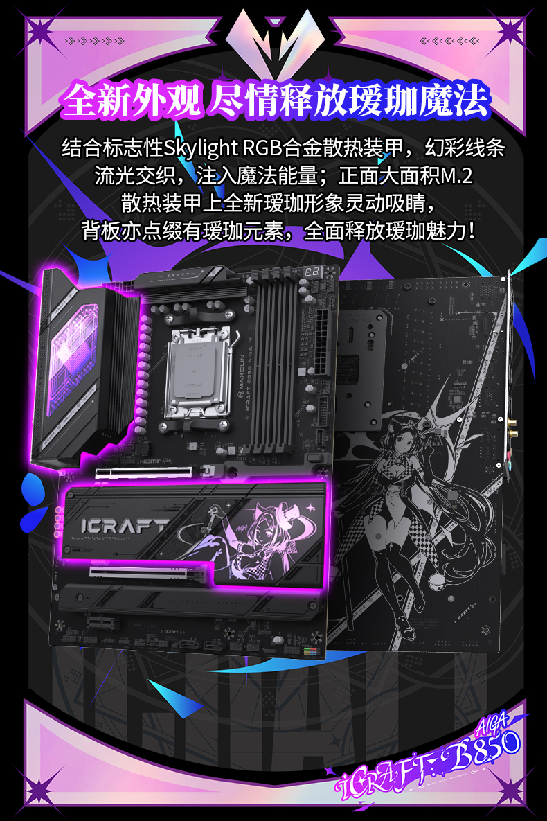 如果說AMD銳龍 7 9850X3D 處理器是性能核心,那銘瑄iCraft B850 AIGA主板就是為其量身定制的 “魔法戰甲”。它將二次元美學與旗艦級硬件規格深度融合,讓裝機不僅性能強悍,顏值更是賞心悅目,成為顏值黨與硬核玩家共同追捧的心頭好。