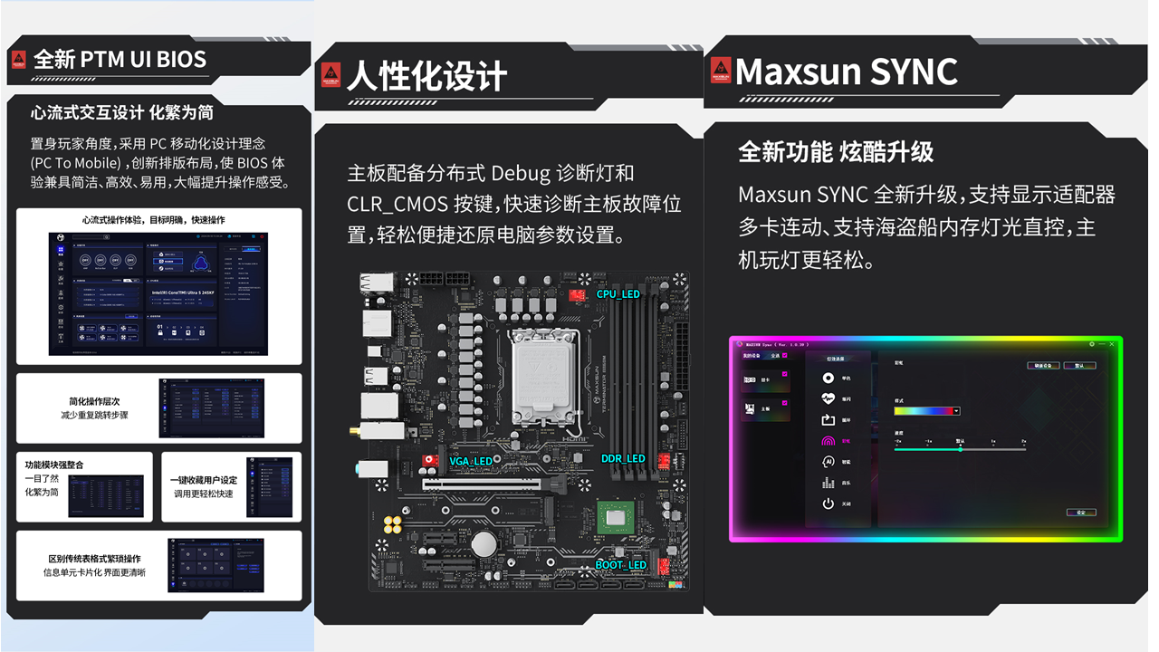 除了硬核配置,這款主板的貼心設計,更是讓裝機和使用體驗直接拉滿。全新升級的PTM UI BIOS,借鑒手機 APP 的交互邏輯,采用模塊化設計,交互層級不超過 2 層,手機端風格的卡片式界面,讓復雜的 BIOS 設置變得簡單易懂,即使是新手玩家也能輕松上手。分布式 Debug 診斷燈和CLR_CMOS 快捷按鈕能快速定位故障,小白也能輕松排查問題,讓裝機全程省心省力,告別復雜操作。它還支持RGB光效同步,可與顯卡、內存等外設實現燈光聯動,隨心切換炫酷燈光效果,無論是打造黑色電競主機,還是組裝純白海景房,都能完美適配,輕松打造氛圍感拉滿的裝機效果。